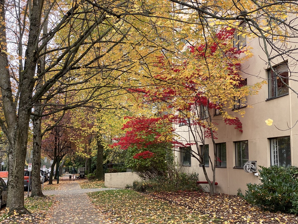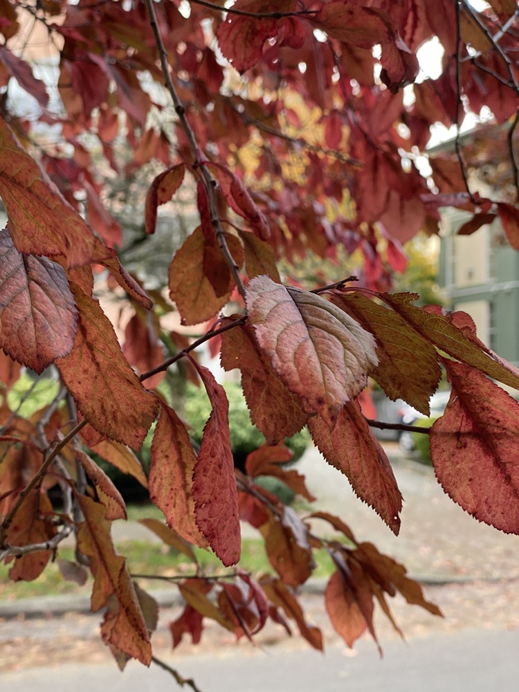 I am walking home after coffee with my sister in early November and I see these branches arching over the sidewalk so that their currently yellow leaves (the trees are Armstrong red maples so they will turn red) are mingling with the scarlet leaves of a Japanese maple.