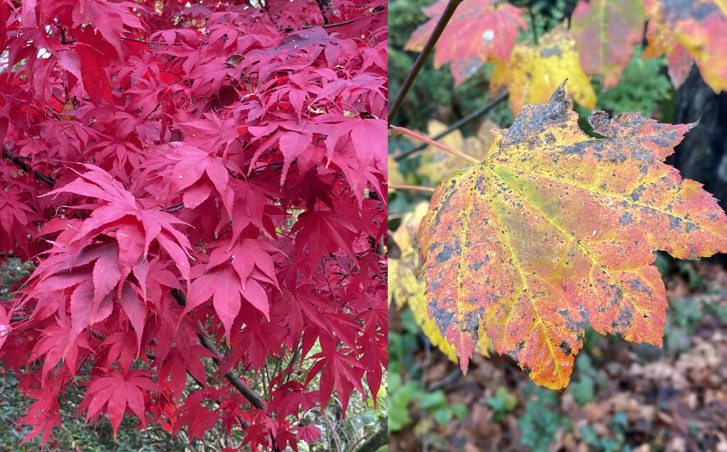The habit and leaves of three maples are similar: two are from Japan, (1) Acer palmatum, Japanese maple, which is more common; it is in the street scene above and the photo on the left, and (2) A. japonicum, fullmoon maple, less common; and (3) the one that’s native to Canada growing in forest understorey, A. circinatum, vine maple, though not a vine at all! The leaves are palmately lobed, though the Japanese maple’s lobes are longer than those of the vine maple.