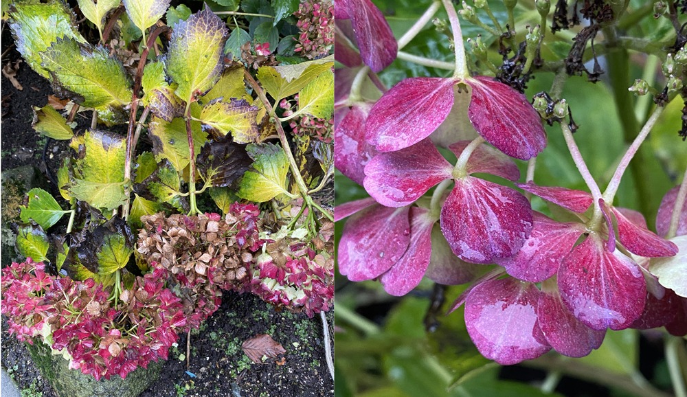 These hydrangea plants grew near each other in a laneway garden. On the left is Hydrangea macrophylla, bigleaf hydrangea. On the right, is a lacecap hydrangea, species name unknown. Its striking fuschia-coloured sterile florets now hang down, their work of attracting pollinators done.