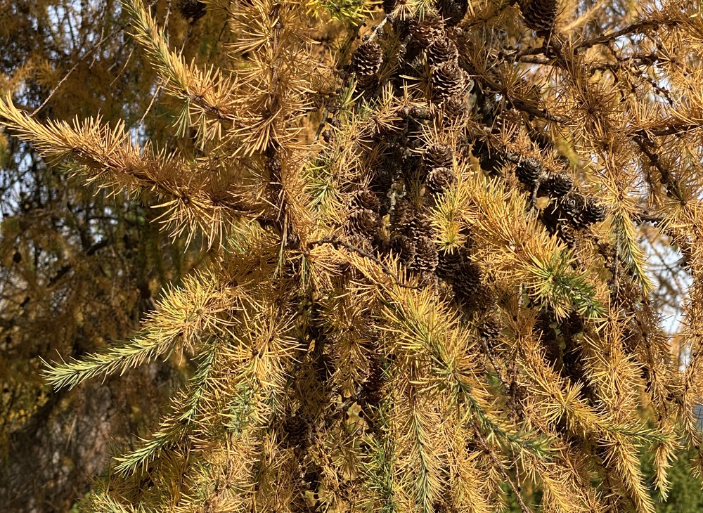 To my eye, these are the prettiest of the larch cones. This tree growing in Stanley Park is a Larix kaempferi, Japanese larch. Its needles in early November are losing their spring and summer green and turning oranges and lemons before falling, leaving behind the seed cones to continue maturing.