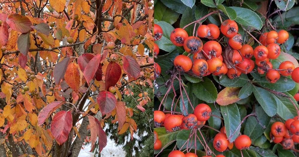 On the left is Malus tschonoskii, tschonoskii crabapple, its leaves turning from gorgeous oranges all the way to deep reds. On the right is a shrub of Pyracantha coccinea, scarlet firethorn, growing as a hedge. This plant is evergreen, sometimes semi-evergreen.