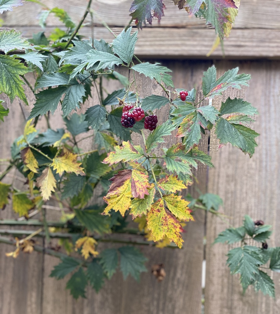 This is Rubus leucodermis, western raspberry, being cultivated in a lane, even though it is native. The still-ripening berries are moving from red to purple and eventually to black.