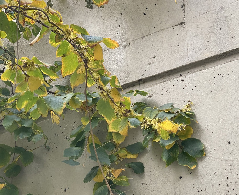 First come the strappy yellow flowers of Hamamelis virginiana, common witchhazel. It is growing in a lane.