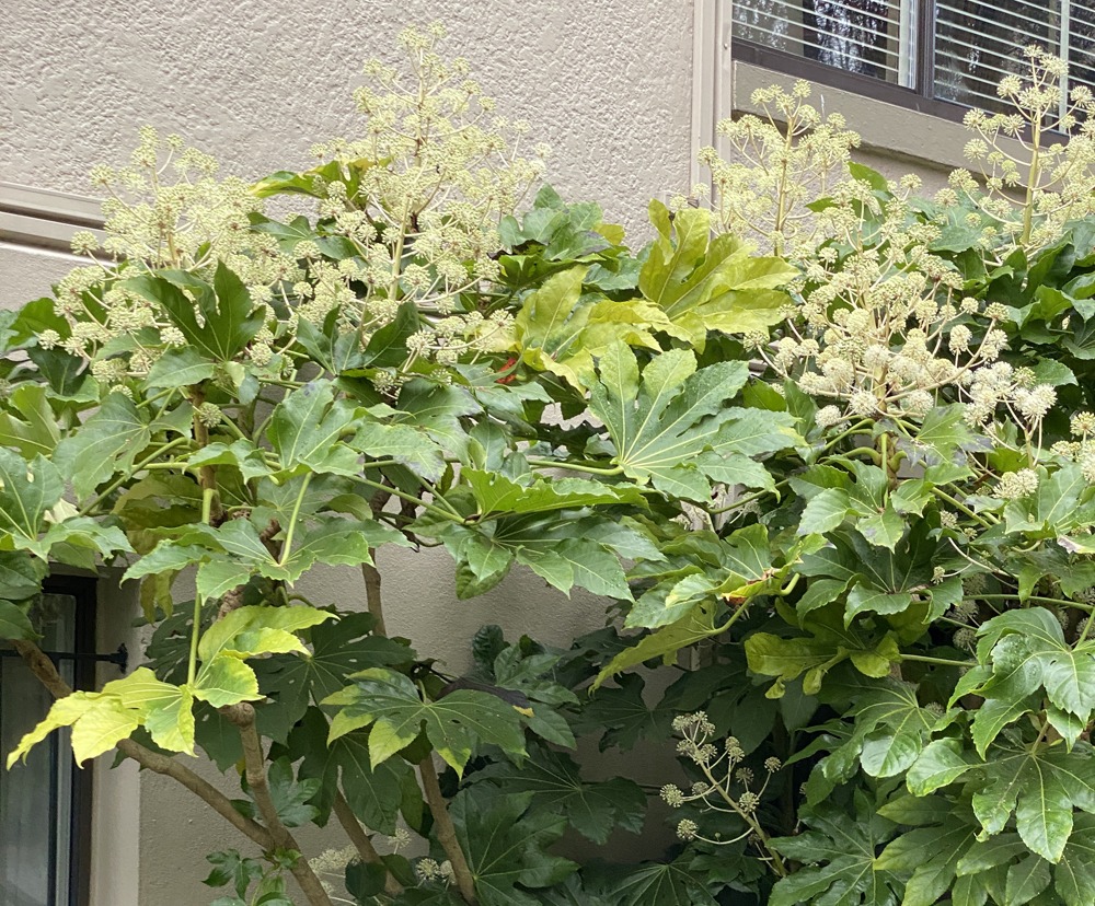 Next are the panicles of cream-coloured umbels of Fatsia japonica, Japanese fatsia. This shrub is in Araliaceae, the ginseng and ivy family, which includes many invasive plants such as English ivy (Hedera), and devil’s club and Aralia elata, angelica tree. The large palmately lobed leaves vary in colour from green to yellow to variegated. Much of this particular plant suffered and froze in last year’s extremely cold temperatures, but it is back to full bloom here in November 2025.