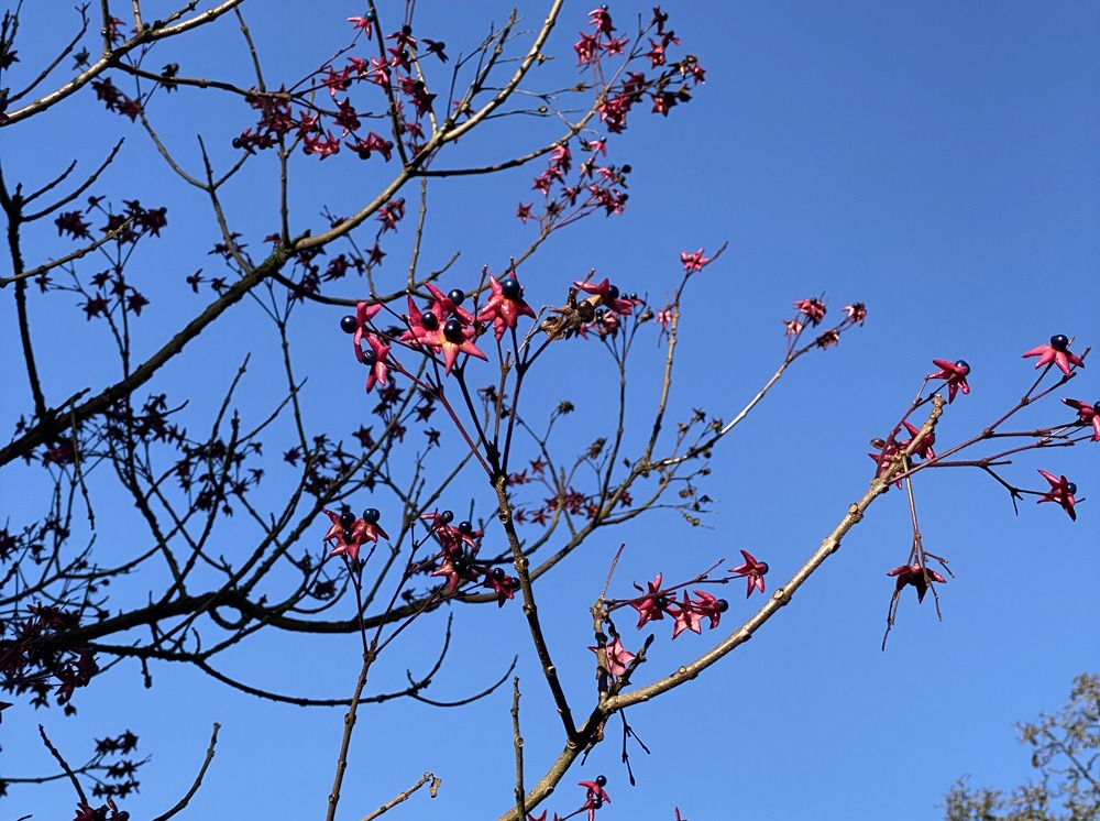 This shrub that’s been pruned to be a tree is Clerodendrum trichotomum, harlequin glorybower. Actually, it is not always glorious! Being surrounded by a calyx of bright pink sepals, the once-blue-now-black fruit are available for the birds to eat the flesh and disperse the seeds.